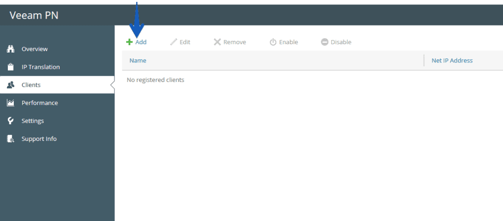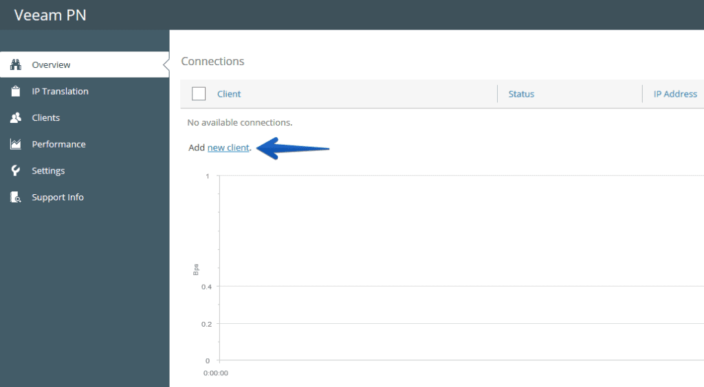 We have one more step to have all the configuration ready in the Veeam PN Hub, we will go to Overview – Add new client, or directly in the Clients tab:
