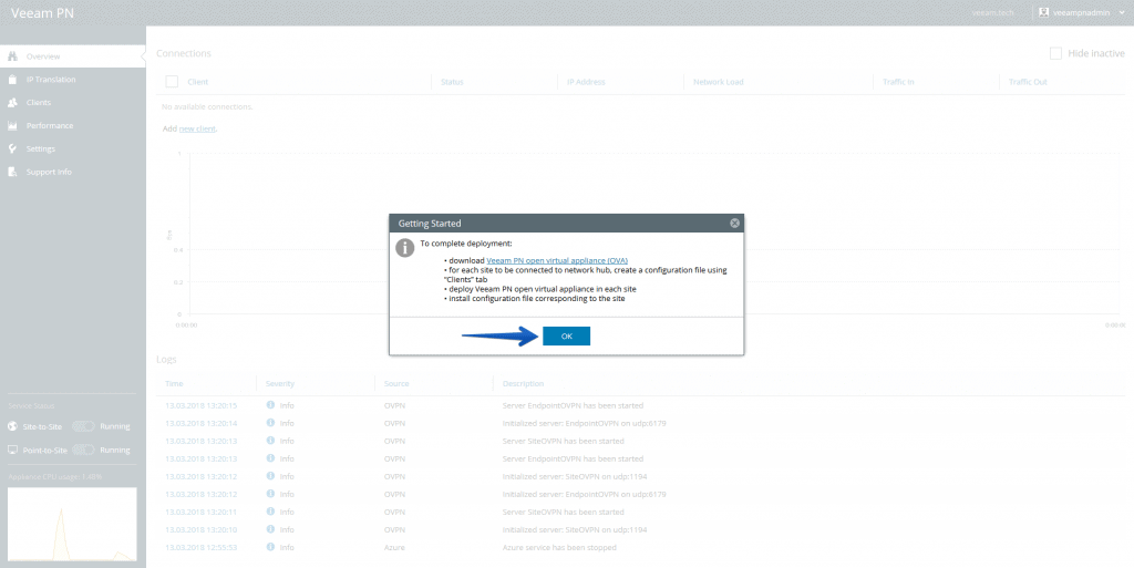 Now that we have already deployed the VM in Azure with Veeam PN inside, we will open by https the Veeam PN IP https://veeam-pn-ip