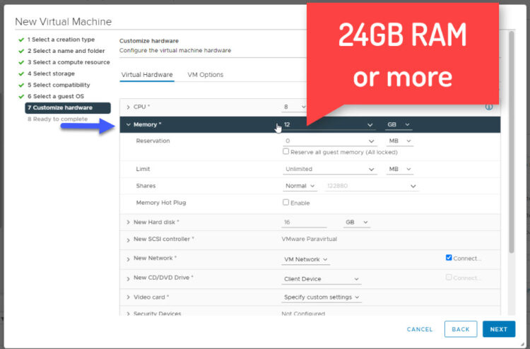Let’s go ahead now and create a new VM on our vSphere: We will select now the option called Create a new virtual machine: Let’s introduce a name for this VM, on my case just called OVIRT-NODE, as it will be my first Hypervisor: You can always place the VM inside a ESXi Host, Resource Pool, or Cluster, on my particular case, I am just adding this directly into one ESXi that was a bit empty at the moment: Now it is time for us to select a Datastore, oVirt will not use much space in the OS itself, same pretty much as an ESXi, as everything is in RAM, and the VMs are stored on the NFS I put on the System Requirements: The usual Hardware Compatibility, I have selected ESXi 7.0 U2 and later: I am going to select Red Hat Enterprise Linux 8, as at the end the oVirt ISO is CentOS Stream, CentOS 8 if we want to say things clear: In terms of Virtual Hardware, on for the CPU part, make sure you give 8vCPU or more, and you enable the “Expose hardware assisted virtualization to the guest OS” In terms of RAM, I do recommend 24GB or more, as you would like to deploy a few VMs inside, and they will require tons of RAM I am sure: Finally, for the rest of Virtual Hardware, nothing special, just 100GB for the OS PARAVIRTUAL, a vNIC with VMXNET3, and the ISO we have just downloaded: