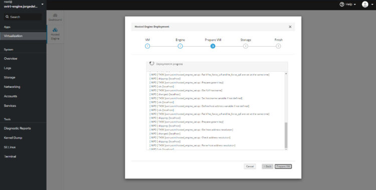 After it boots for the first time, something interesting will appear, cockpit it is enabled by default on the oVirt ISO, so we can go directly to the URL: We can now login into the cockpit with the root user and password that we have introduced while on the installation wizard: Cockpit it is a great Server Management, you can see a lot of useful information, and make some changes to the server, firewall, etc. One of those advanced things you can do is to enabled Hosted Engine, so we convert this vanilla VM into a oVirt Hypervisor Host (the ESXi in VMware terms): Process is simple, it will ask us for an FQDN and IP for the controller VM (the vCenter if we talk VMware language) This specific password it will be for the admin user for the oVirt Admin Panel, you can configure as well the SMTP notifications if you like: It is everything ready, so we click on Prepare VM, and if everything is set up properly, we will see the debug log of the operation of enabling oVirt Host Engine on this Server: The process takes easily around 30 minutes, to take your time, grab some coffee, or go and check the Internet, etc. Sweet! The first step has finished, if we click Next: It is asking for Storage, where oVirt will save the VMs, etc. On my case, it is much easier to just point to an NFS: We will click on Finish Deployment, and it will take another 15 minutes more or less: Now that everything is ready, click on Close: