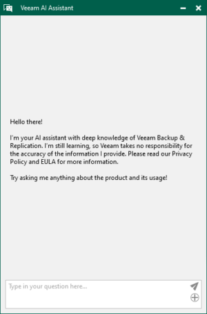 - Privacy and Security Focused: The AI logic runs on a private Microsoft Azure instance, managed by Veeam, ensuring that conversation data remains confidential and is not shared with third parties. No customer-specific information from production environments or customer records is provided to the AI assistant.