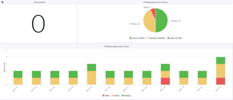 - Backup Dashboard: The application includes a pre-built dashboard that provides a snapshot of recent backup activities, incidents, and detailed insights when needed. This dashboard is designed to give IT teams quick access to essential backup data, aiding in swift decision-making and operational oversight.