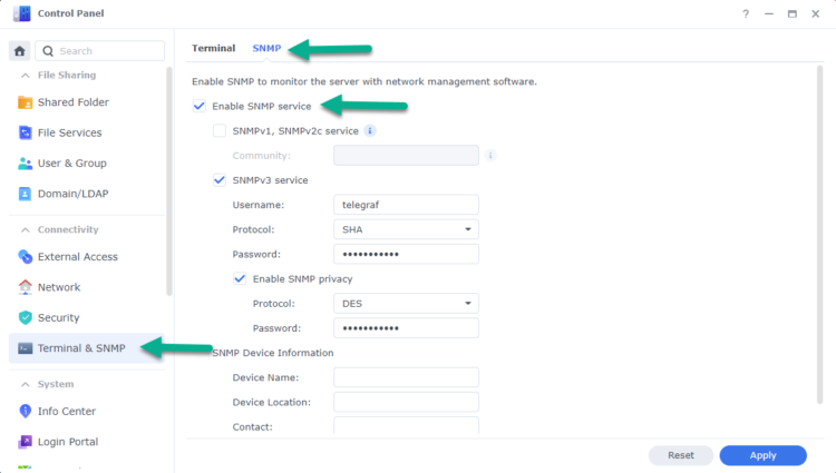 I got a few dozens of comments about the dashboard not working for QNAP, so, I’ve decided to add this step here, please check if from your telegraf, you can connect properly to your Synology using SNMP v3, like here: