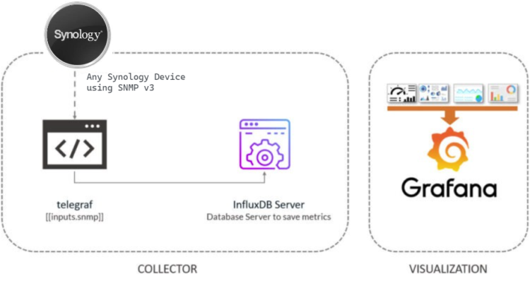 This entry is very similar to the previous ones, we will use telegraf to collect the SNMP information from our Synology, from there we will send them to InfluxDB, and visualize them with Grafana . The design would be something similar to this: