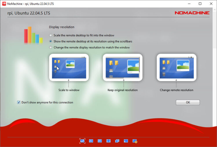 As resolution, I always like to see what the user sees, on the other side, so my default option here is to “show the remote desktop at its resolution using the scrollbars”: