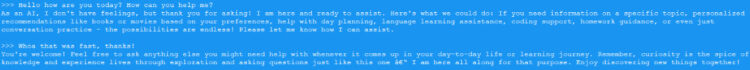 This will download the mode, to the folder we configured above, and execute the LLM for us. We should see something like this, and then we can go and ask whatever we like: