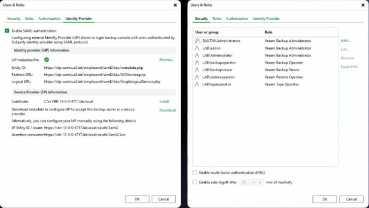 - SAML (SSO) integration: Provides seamless access to the backup console using secure Single Sign-On (SSO), improving user experience while maintaining strict access control.