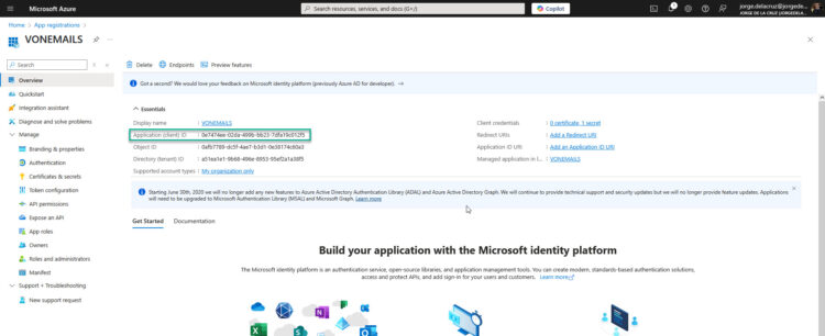 We will need the Client ID as well, that we can find under Overview of the App Registration: