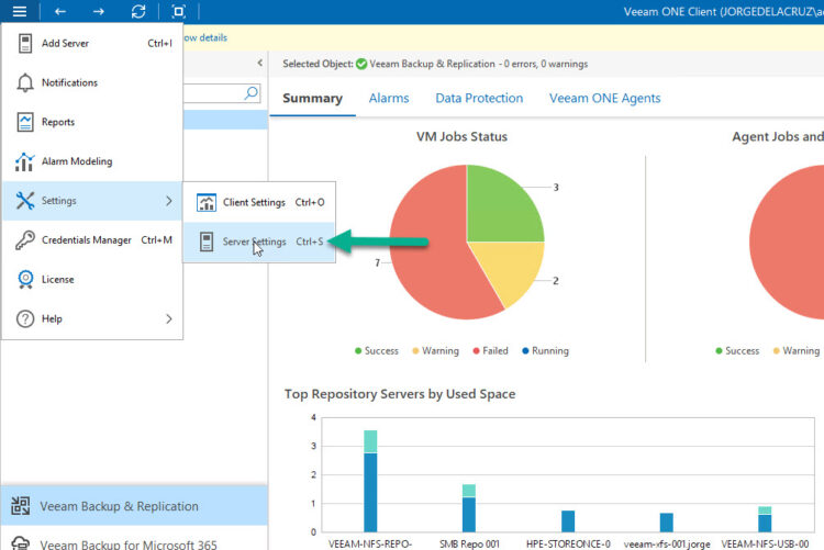 From Veeam ONE Client, let’s open the main menu on the top left, down to Server Settings: