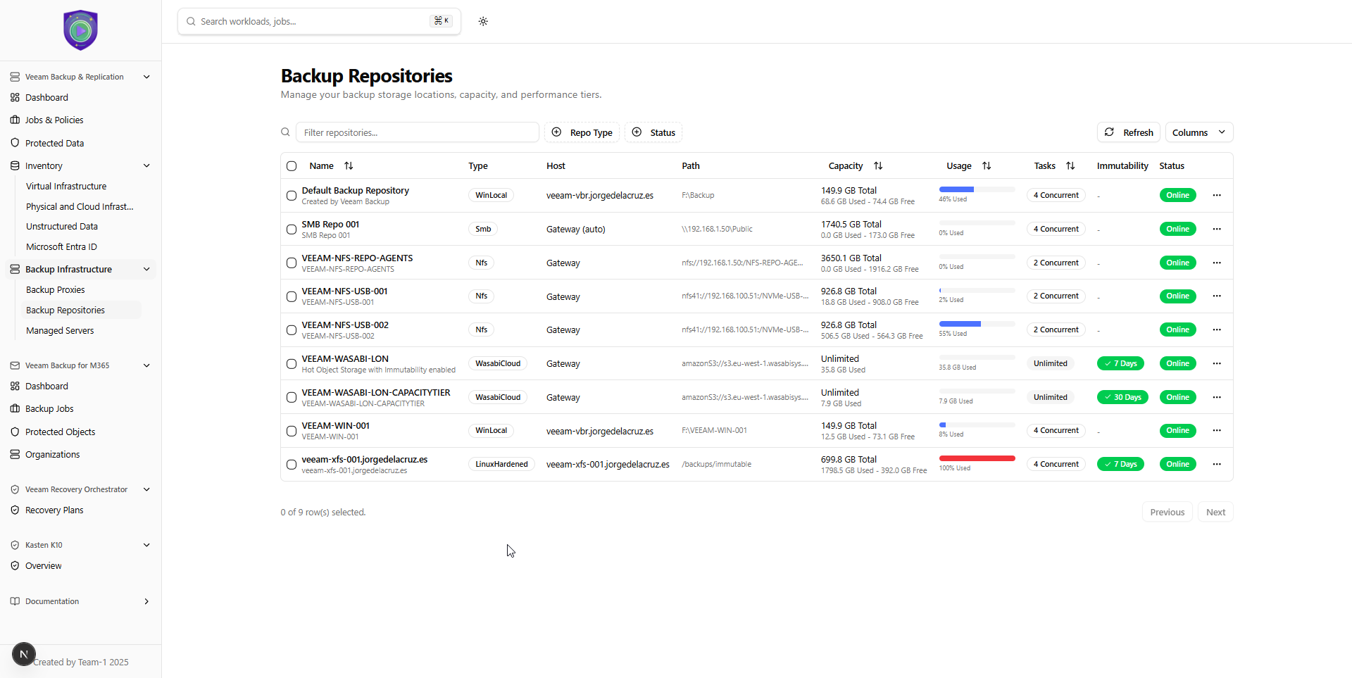 - Veeam Backup & Replication: Dashboard, Protected Data, Jobs and Policies, Inventory, and Backup Infrastructure